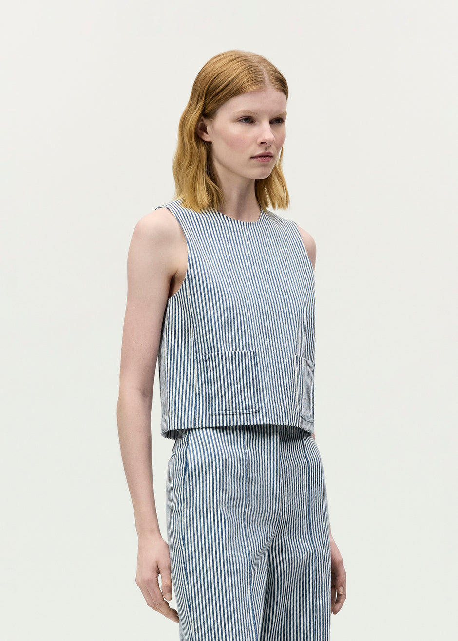 Cut in a high-waisted wide-leg silhouette, the Deeda Pant is rendered in dimensional railroad stripe denim. Pleating details and large cuffs elongate the leg. Pair it with the matching Ludlow Top.