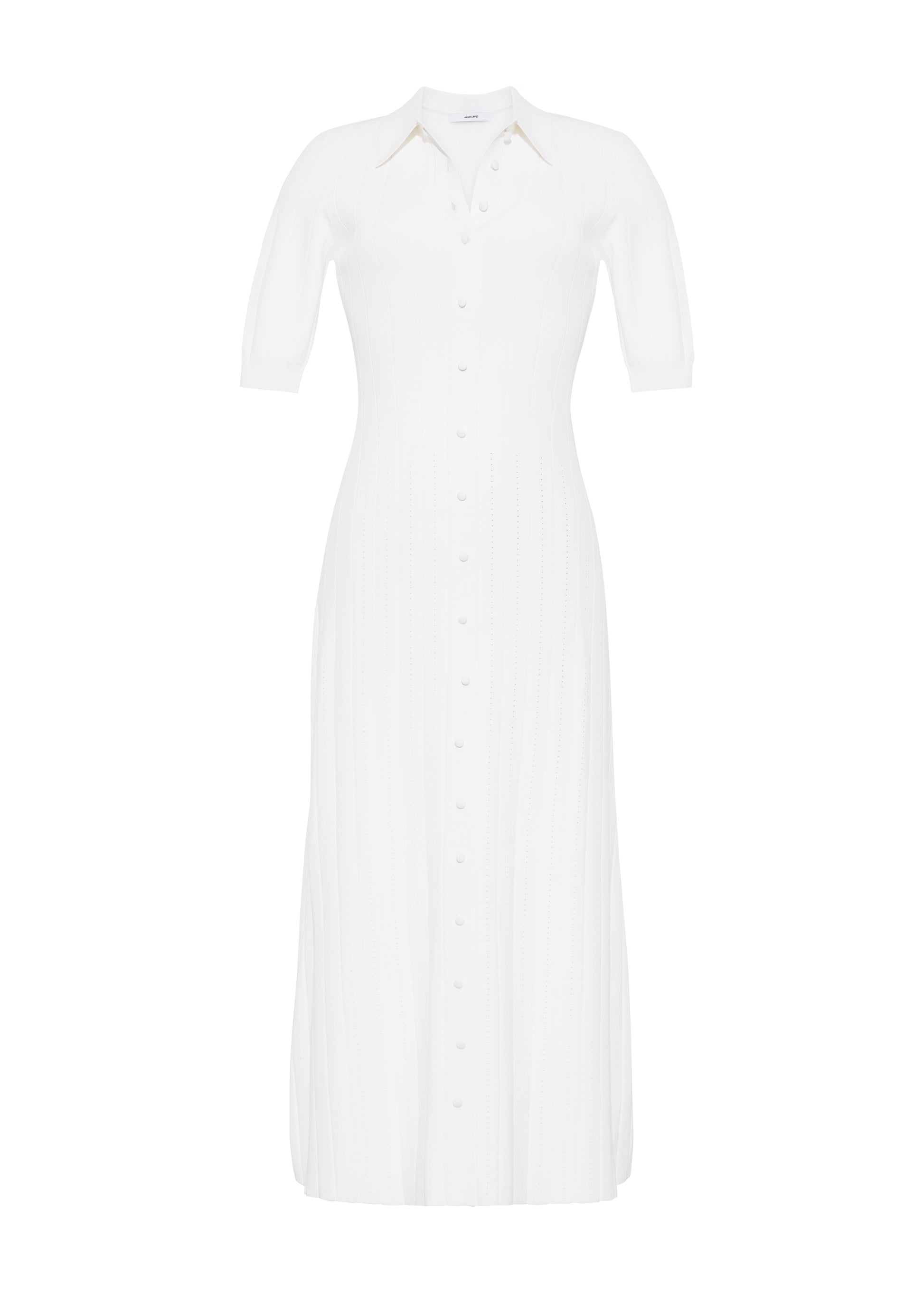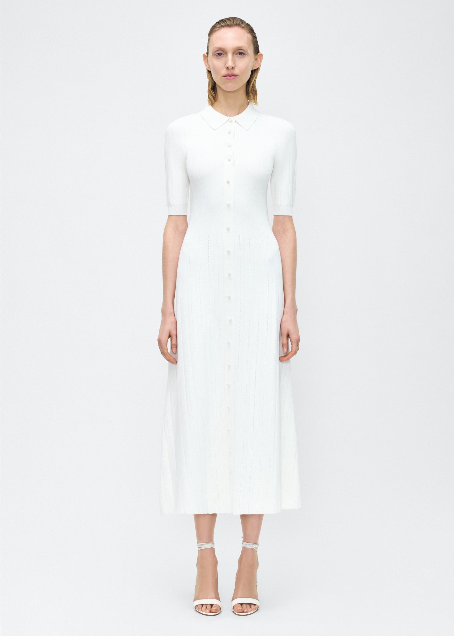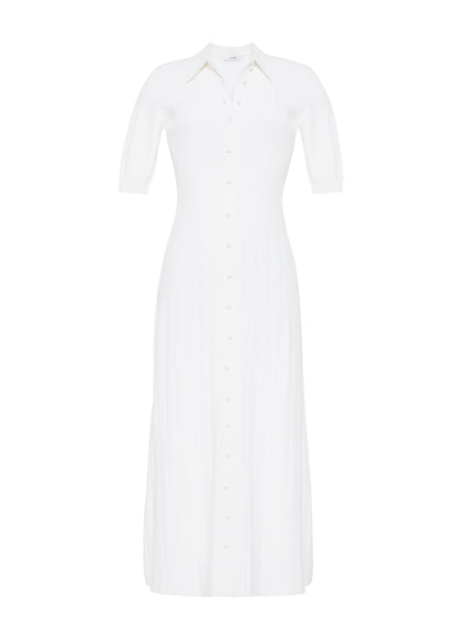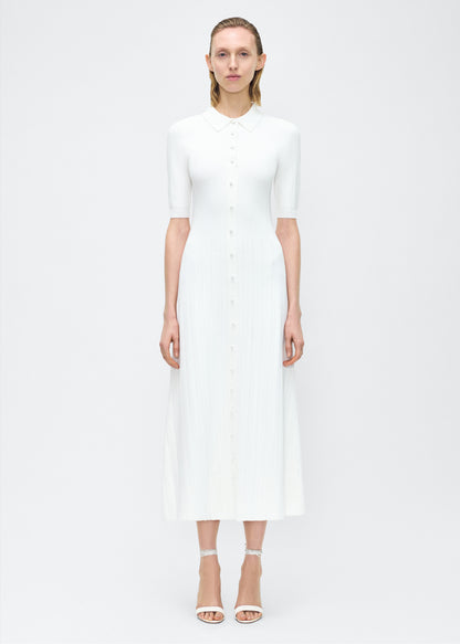 Crafted from a supple, ribbed knit, this dress skims the figure with ease, while an inset panel through the skirt introduces fluid movement. A button-down front and structured collar complete the look.