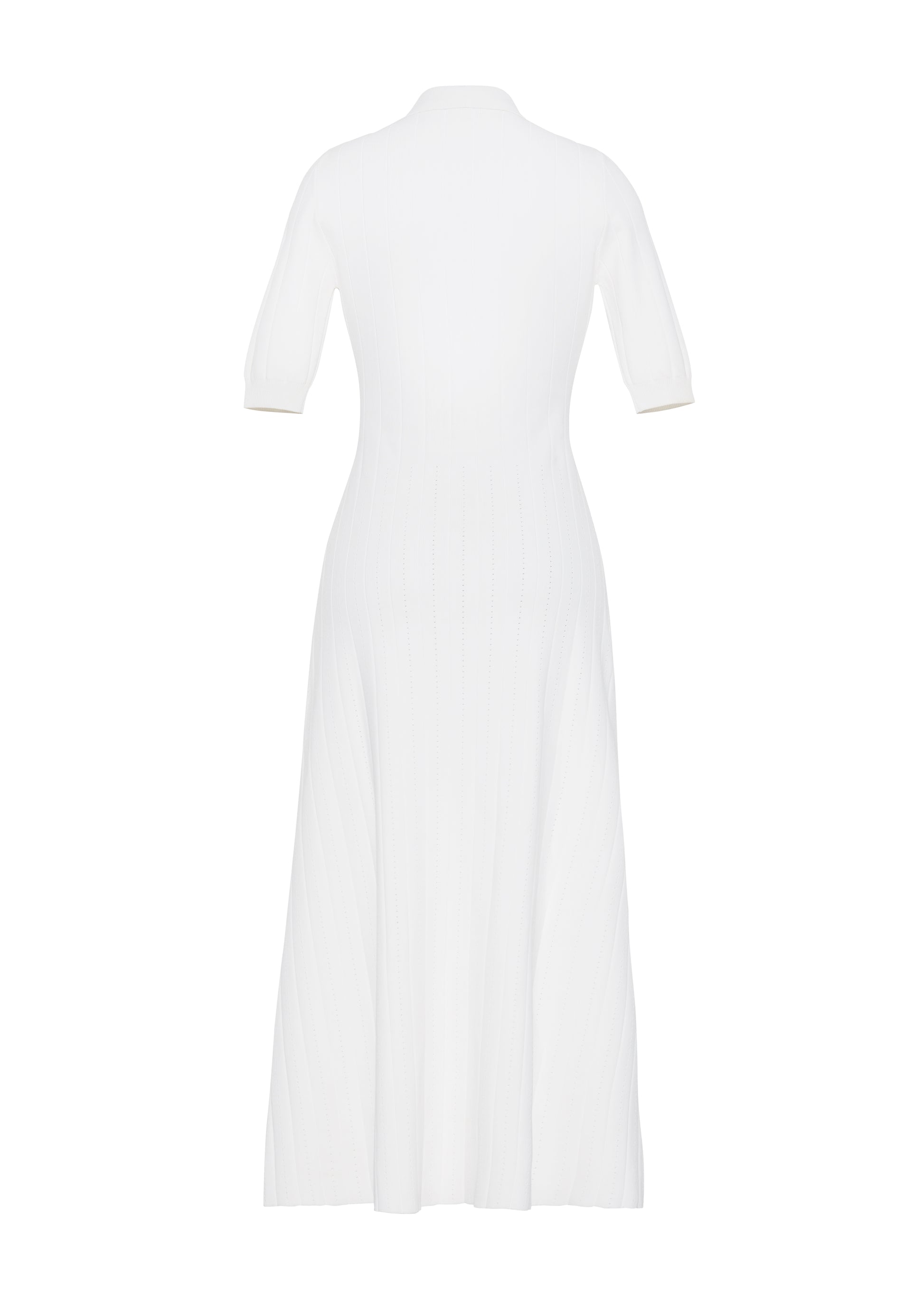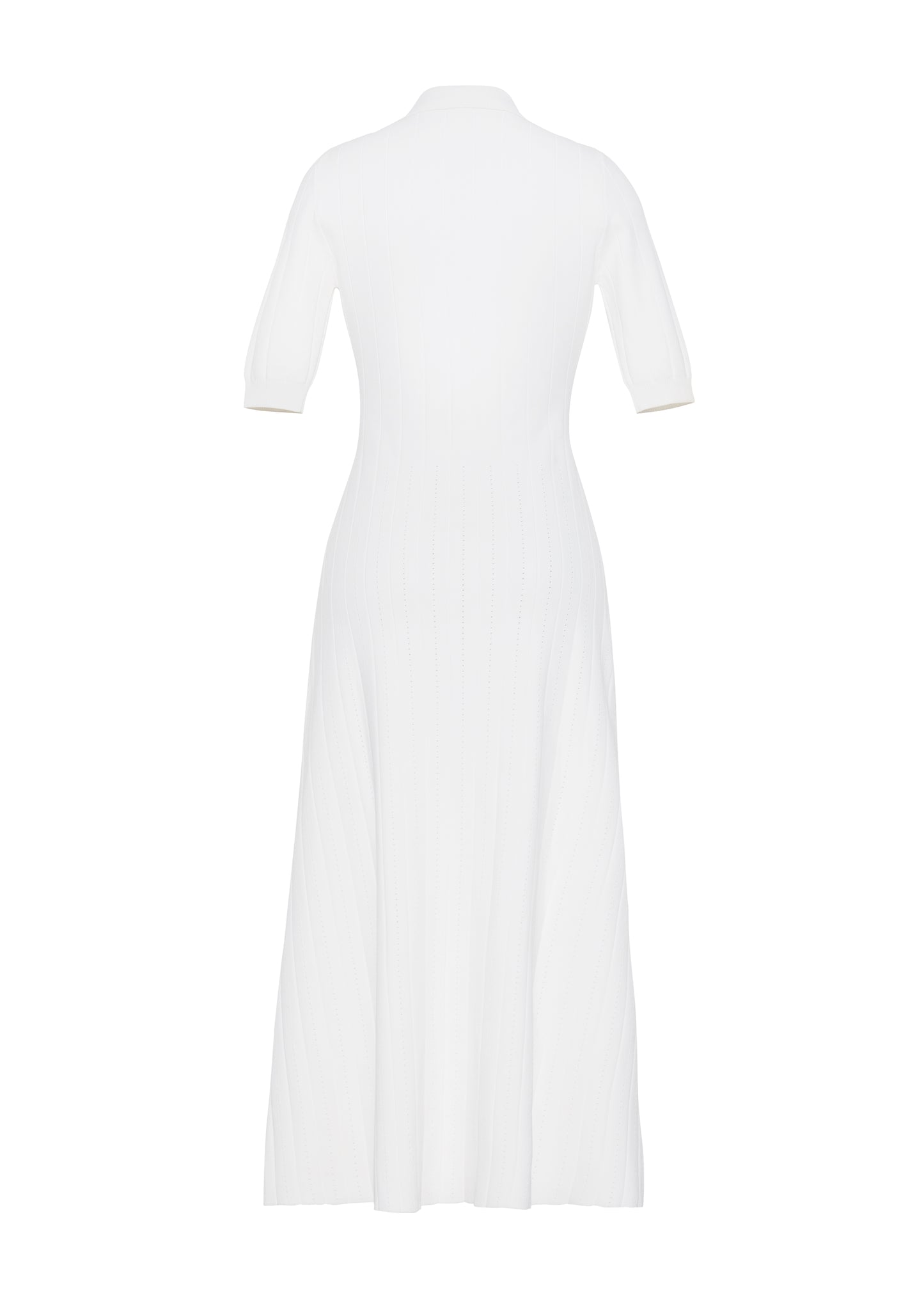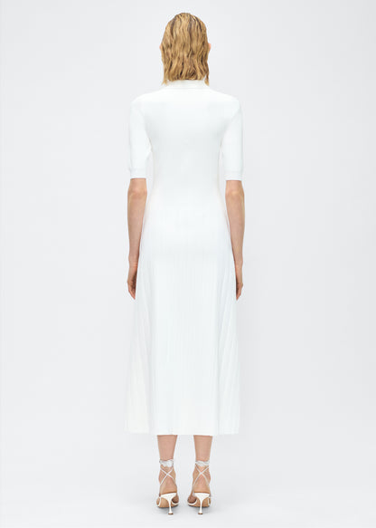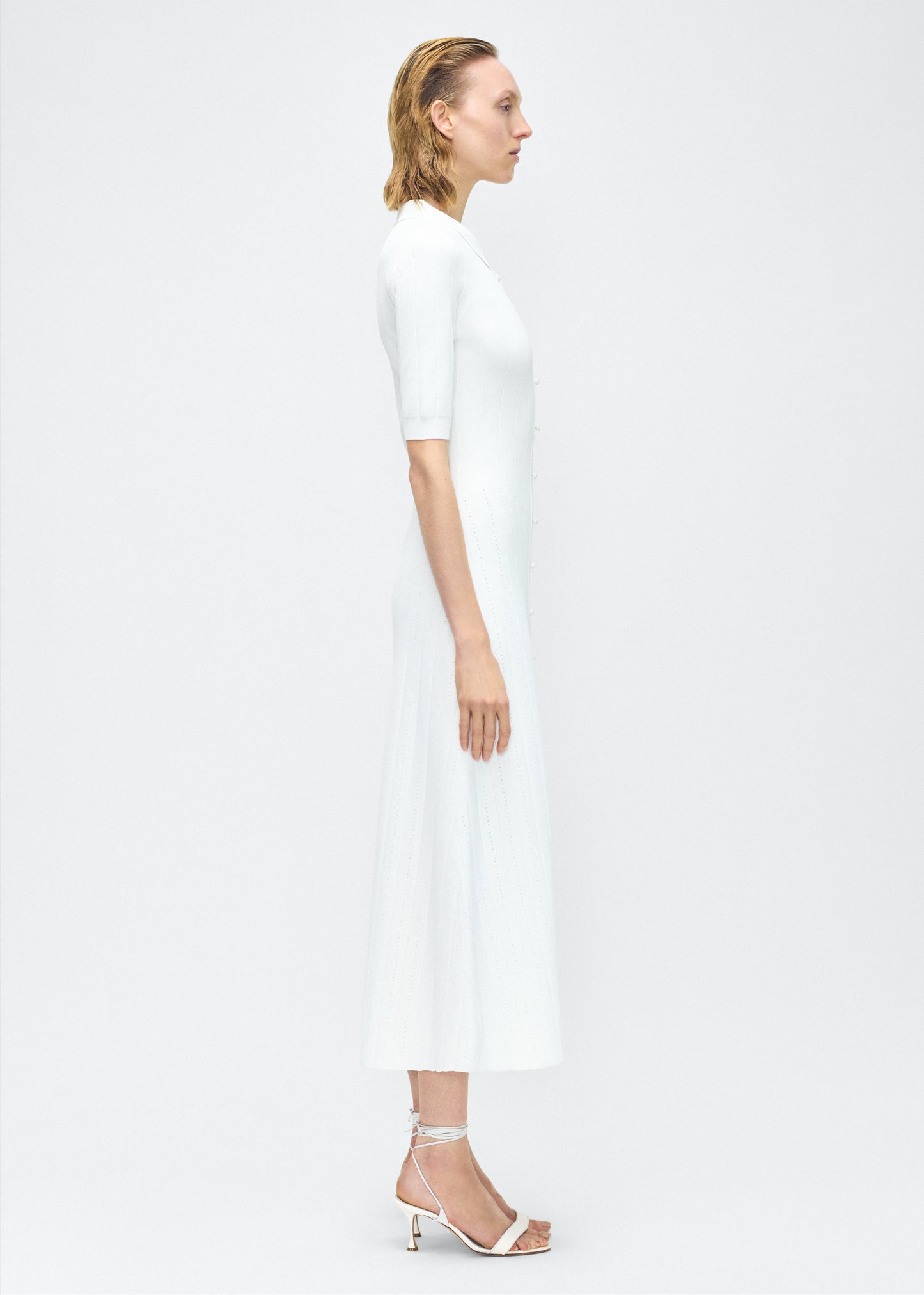 Crafted from a supple, ribbed knit, this dress skims the figure with ease, while an inset panel through the skirt introduces fluid movement. A button-down front and structured collar complete the look.