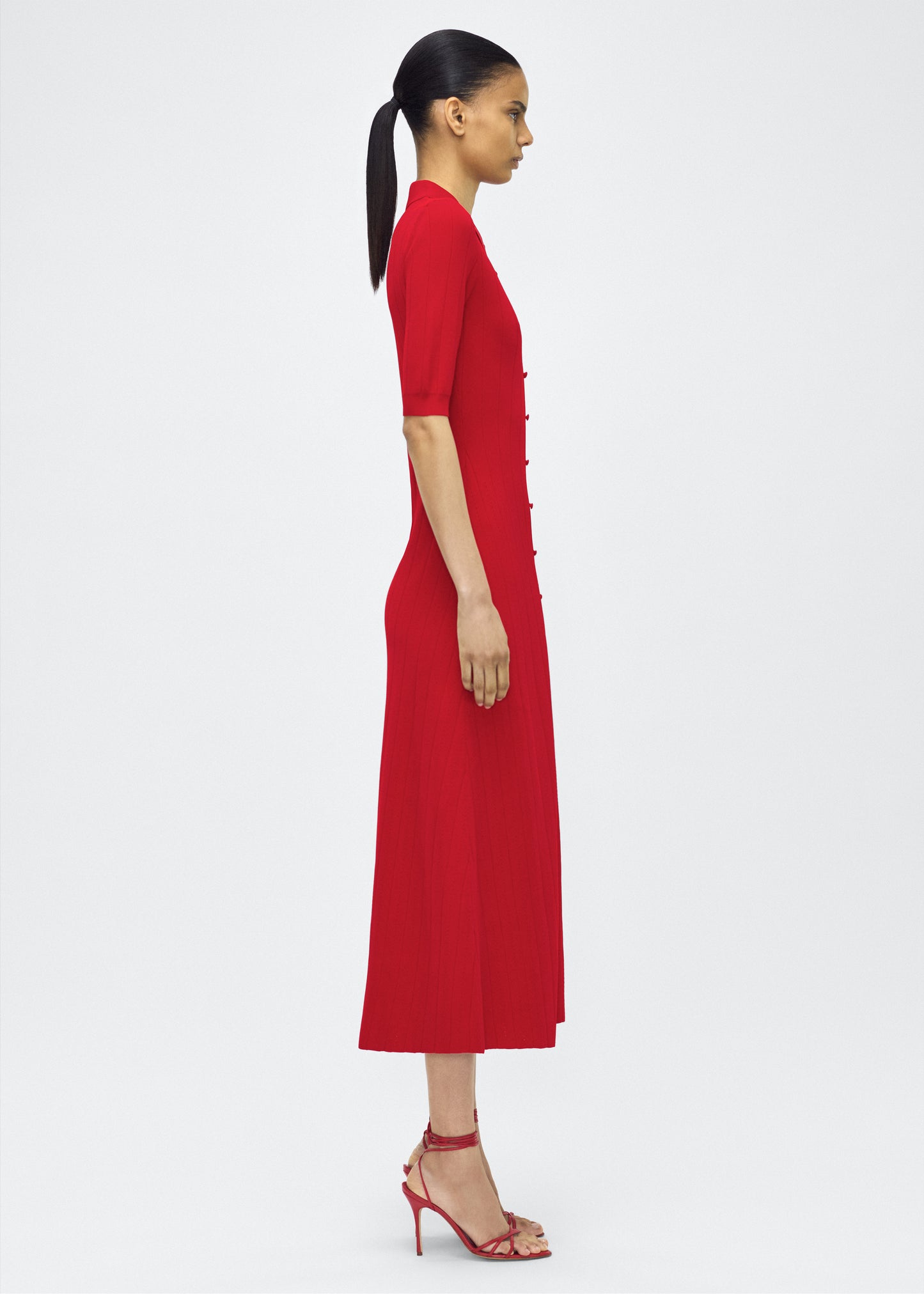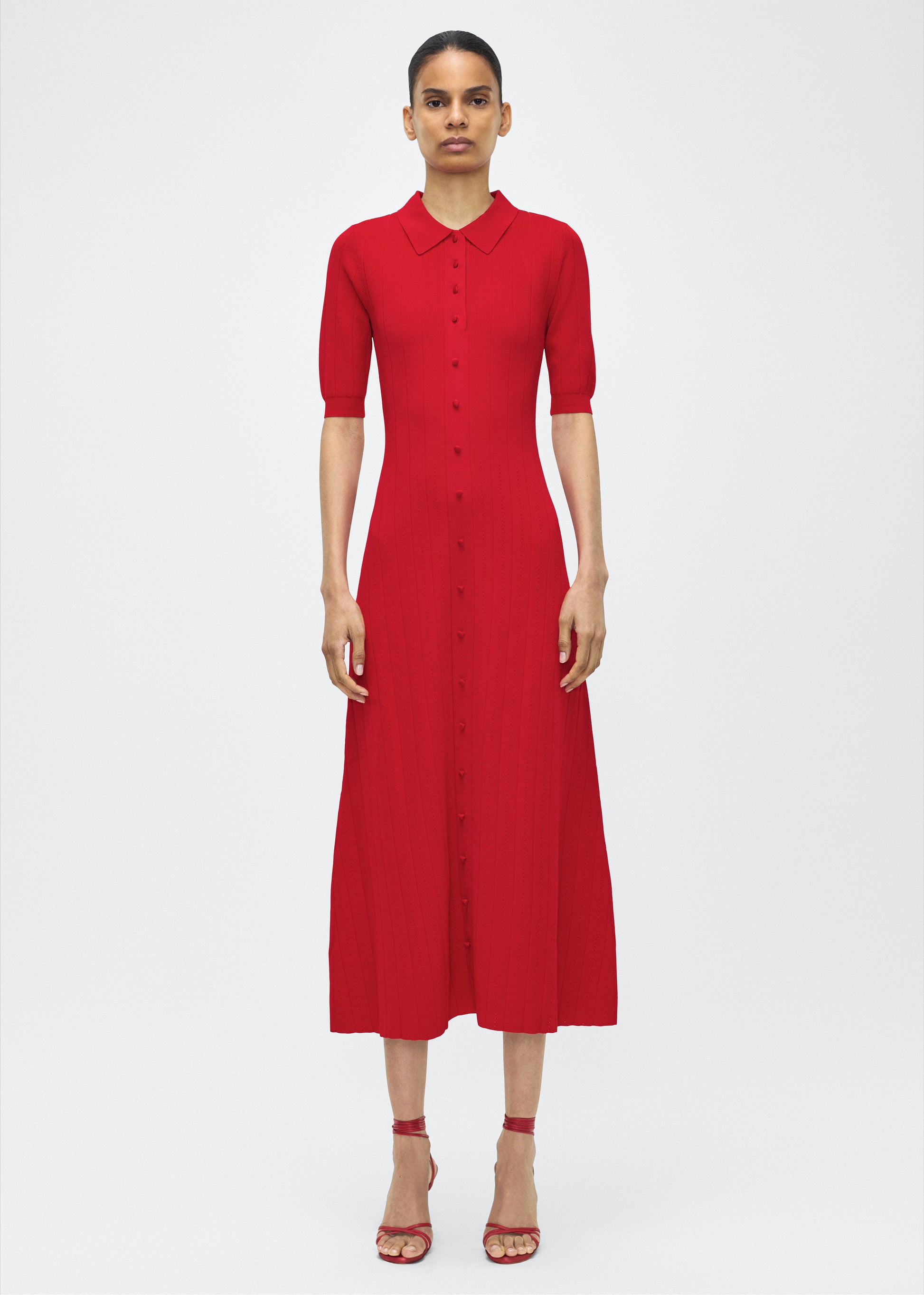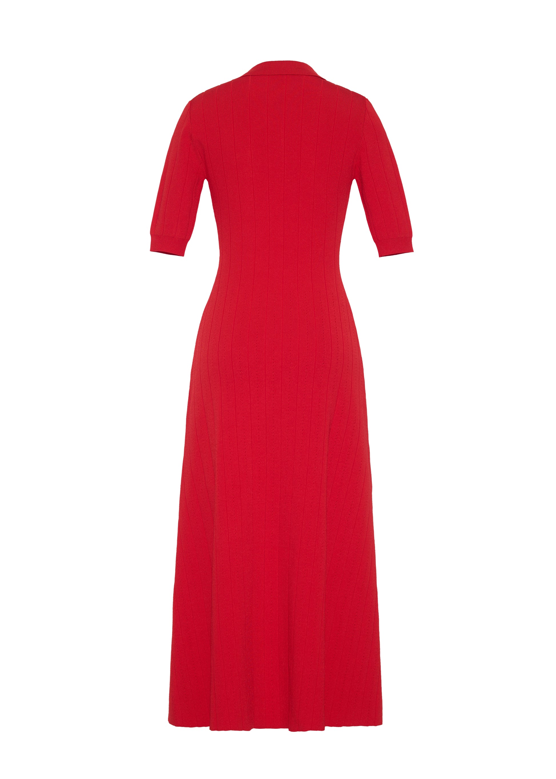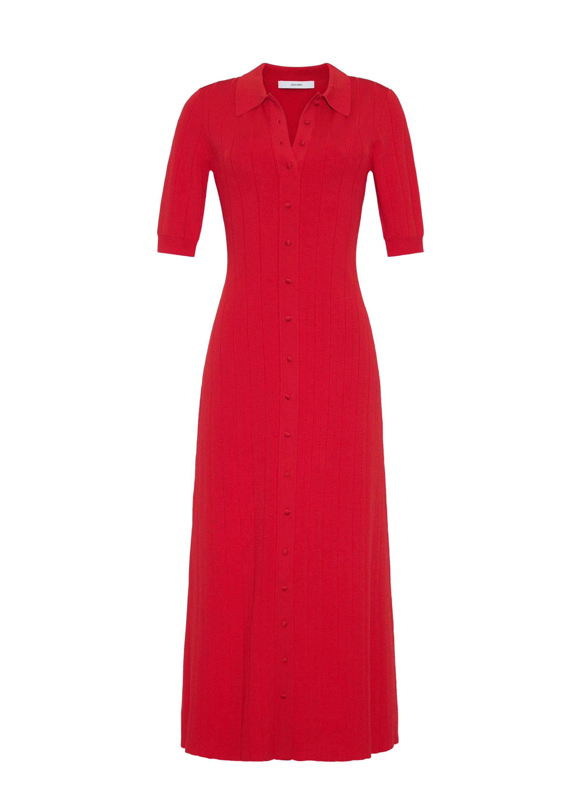 Crafted from a supple, ribbed knit, this dress skims the figure with ease, while an inset panel through the skirt introduces fluid movement. A button-down front and structured collar complete the look.