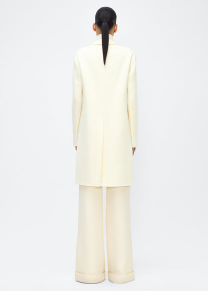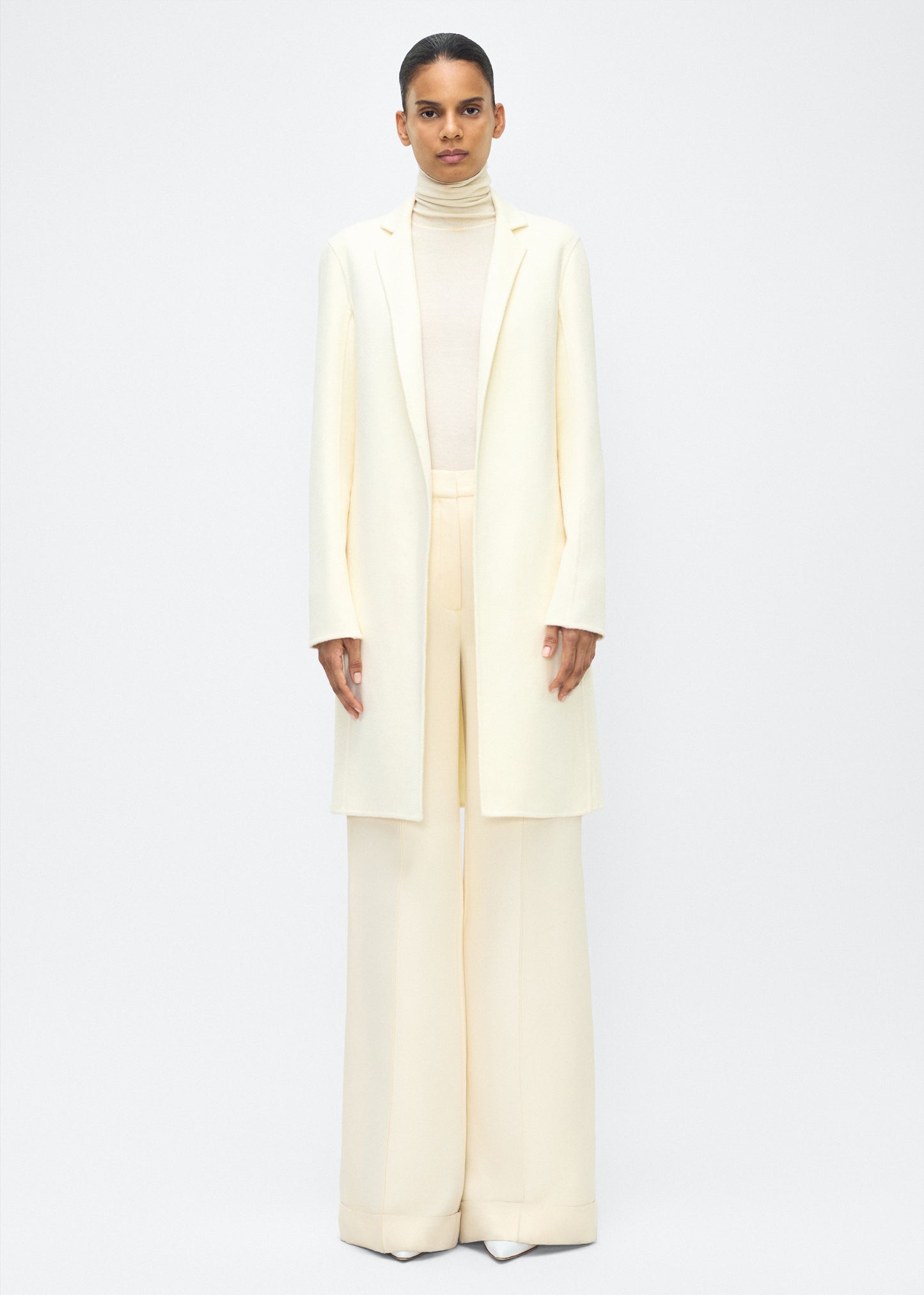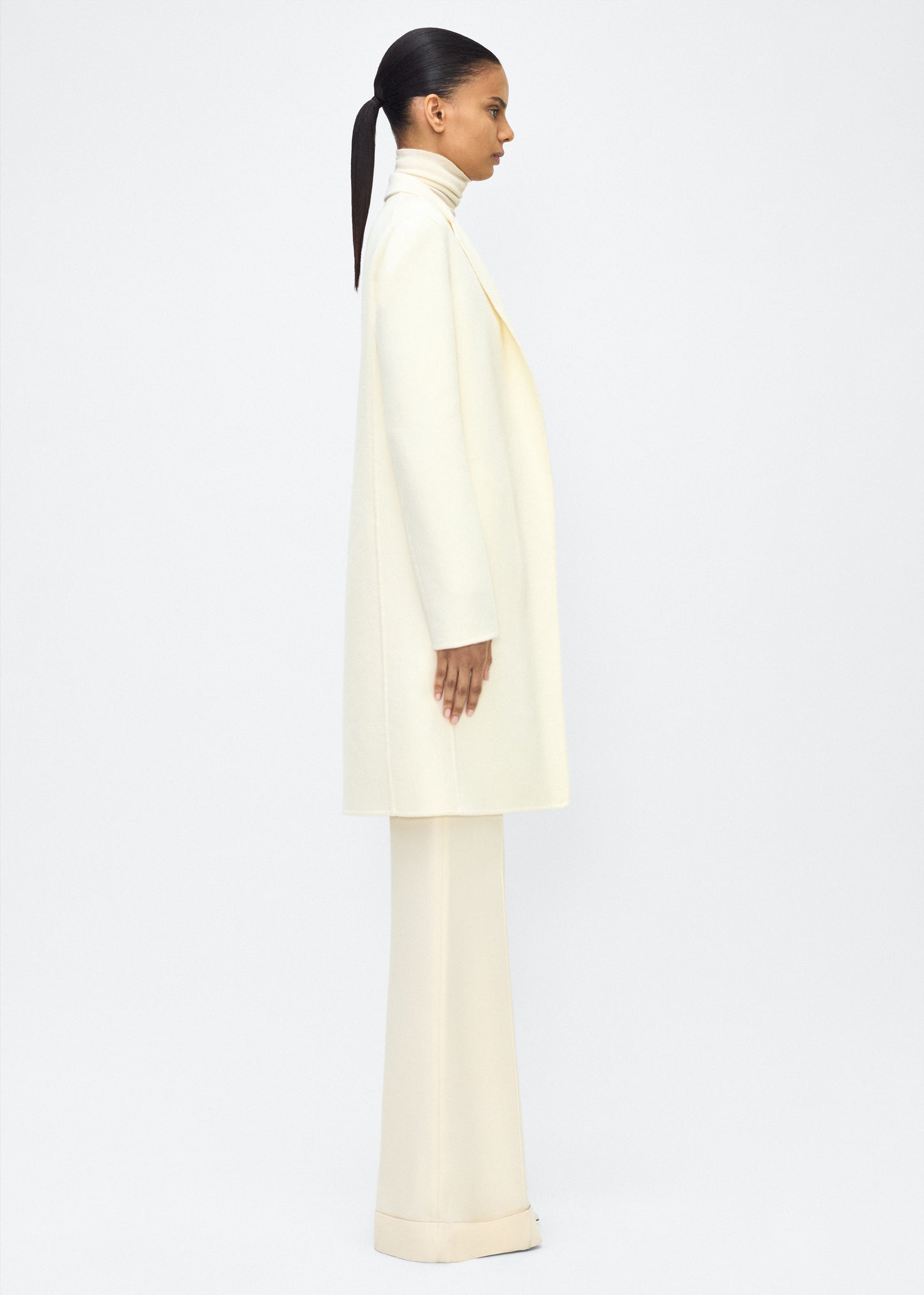 Classic double face cashmere coat with two patch pockets and slender collar.