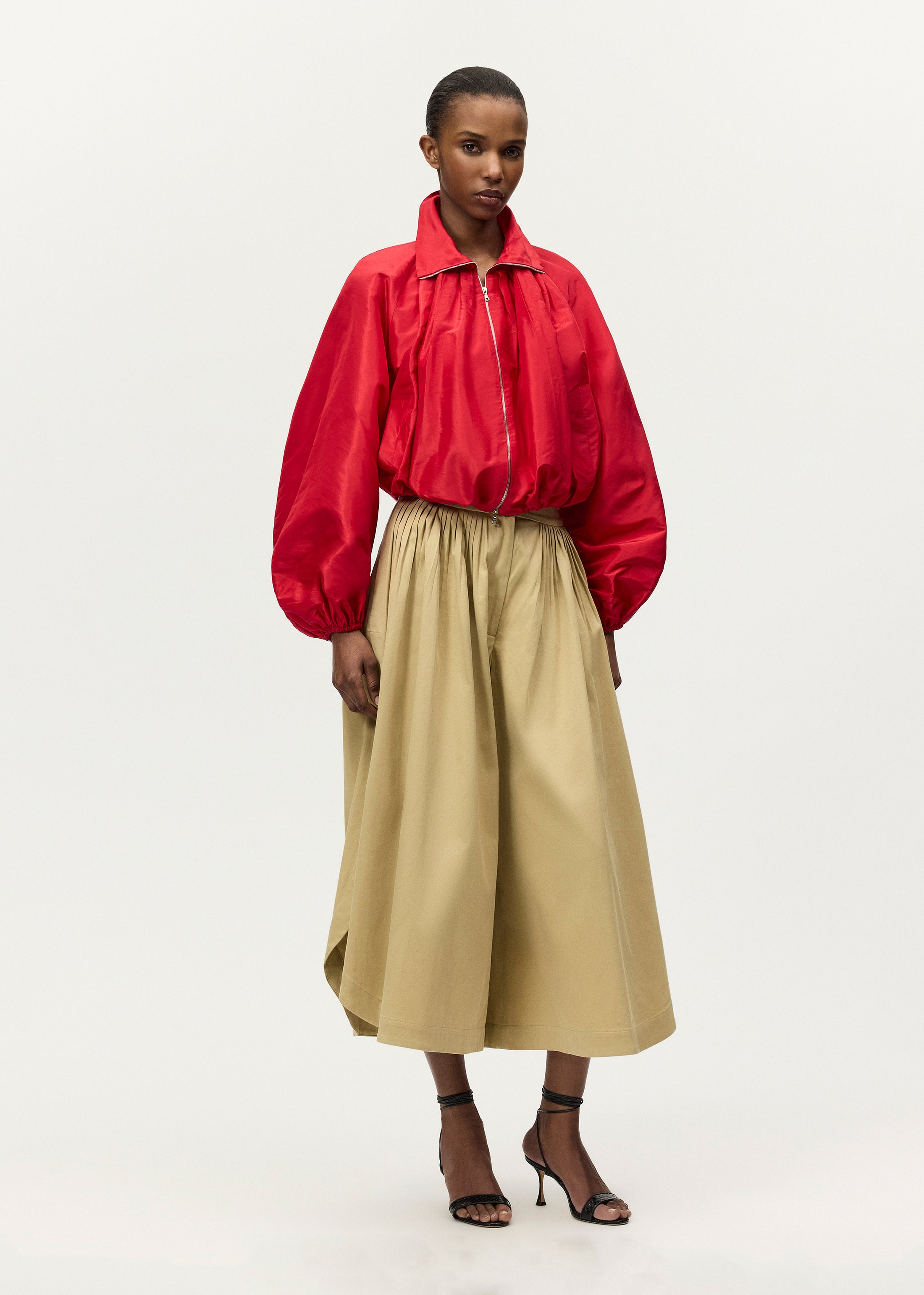 Constructed in rich, water resistant silk taffeta, the Simone Jacket features a funnel neckline and voluminous sleeves with elasticized cuffs.