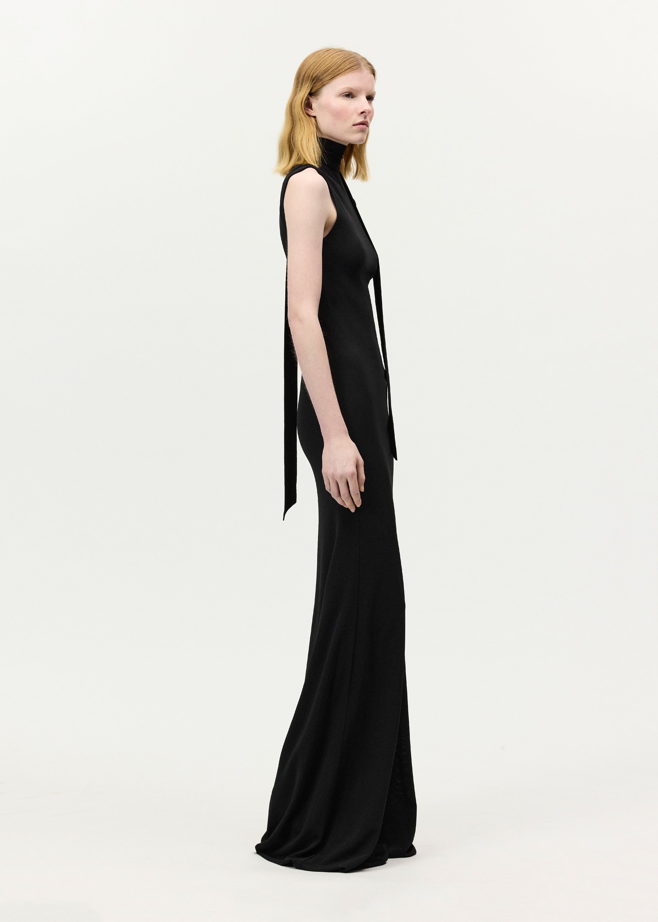 Equally understated and statement-making, the Theo Dress features a sleek column silhouette rendered in jersey. A feminine scarf accents the neckline and can be worn either tied in the back or draped like a scarf.